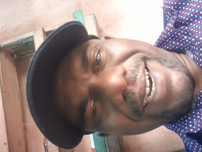A close-up, headshot-style image depicts a dark-skinned adult male, likely a selfie
