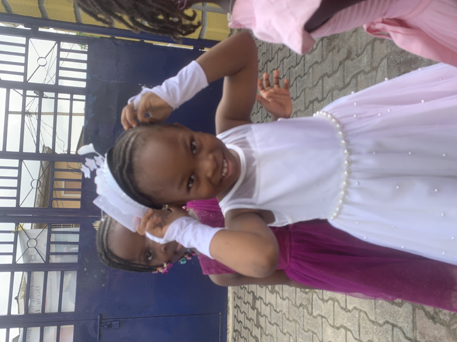 three young girls in a paved area outside a gate. The girl in the center is wearing a white dress with a pearl belt and a white headband. The girl on the left is wearing a purple dress and a white headband, and she is looking at the camera. The girl on the right is wearing a pink dress and is looking to the side. All three girls are smiling. The girls are in the city of Close, Nigeria. The location is in a residential area, possibly near a school. The gate in the background is blue and there are other buildings visible in the background. The ground is paved with gray and brown bricks. The girls are playing and interacting with each other. The overall atmosphere is lighthearted and happy.
