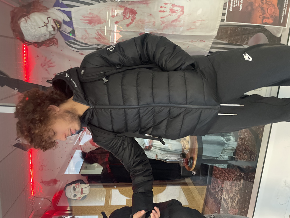 A man with curly hair wearing a black puffer jacket and Nike sweatpants stands inside a store. Through the window, Halloween decorations are visible, including a clown with blood on its clothes, a "Saw" mask, and red lights. Reflective surfaces show other unseen decorations, possibly for a seasonal display.