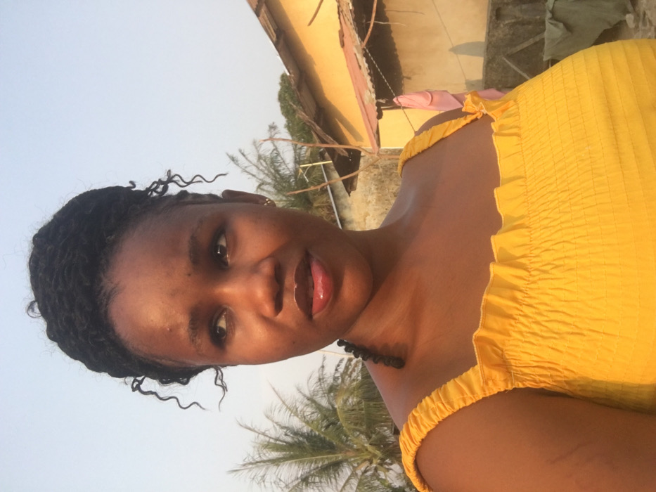 The image depicts a young woman outdoors in Abagbo, Nigeria, positioned in the foreground against an urban or semi-urban backdrop
