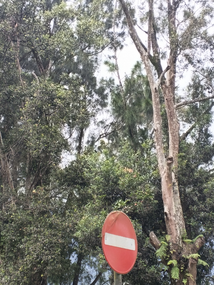 Lush greenery dominates the scene, featuring a mix of tall trees and dense foliage. A vibrant red and white "Do Not Enter" sign is placed prominently in the foreground. It is partially obscured by the surrounding plants and leans slightly. A weathered, light-colored tree trunk stands nearby, with ferns growing at its base, adding a touch of nature's resilience. The sky is overcast, casting a soft, diffused light on the landscape.