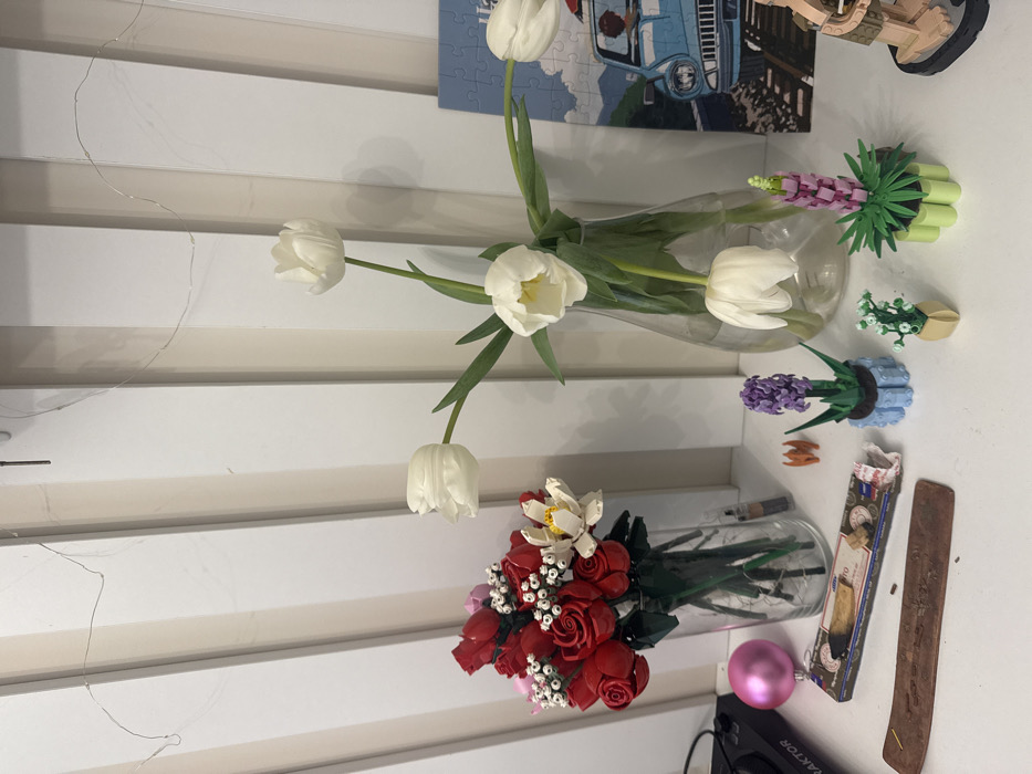 This image captures an indoor still life display, located in the city of Batumi, Georgia. The scene is presented on a white, flat surface, likely a shelf or table, positioned against a white wall composed of vertical slats or panels. A thin string of unlit fairy lights is draped across the upper section of the wall. On the far left, a black electronic device bearing the label "TRAKTOR" is partially visible. Adjacent to it rests a single pink spherical ornament. A clear cylindrical glass vase holds a bouquet of artificial flowers, predominantly red roses and smaller pink blooms, interspersed with white accent flowers, all appearing to be constructed from building blocks. A single artificial white water lily is also integrated into this bouquet. To the right of the artificial flower arrangement, a brown wooden incense holder contains a partially burnt incense stick and ash residue. Beside it lies an open and crumpled packet of "KYOTO" brand incense sticks. Two small, orange, geometric figures, resembling origami, are positioned nearby. A larger, clear bell-shaped glass vase occupies a central position, holding five real white tulips with green stems and leaves. One tulip is noticeably inverted, with its bloom extending downwards into the vase. In front of this vase, three smaller artificial potted plants, also constructed from building blocks, are arranged: a purple hyacinth-like flower in a blue textured pot, a smaller green and white flower arrangement in a beige geometric pot, and a pink and green lupine-like flower in a light green textured pot. On the far right, a section of a jigsaw puzzle or framed image is visible, depicting a light blue vintage car with an identifiable occupant, driving on a road against a backdrop of mountains. A light-colored, sculptural object, possibly a miniature building or monument, is partially visible at the extreme right edge of the frame.