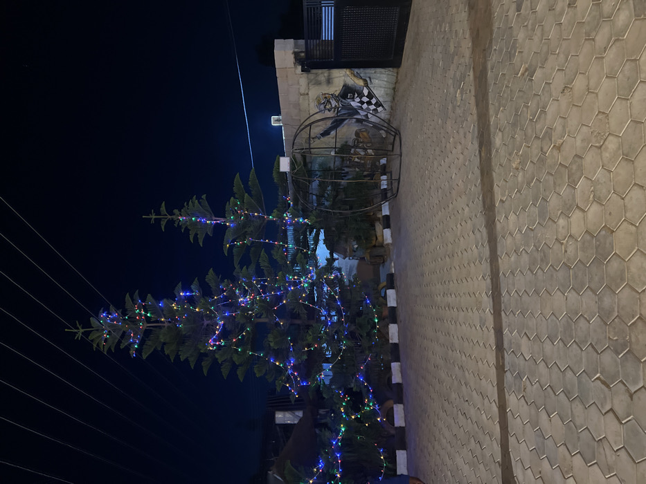 A Christmas tree adorned with multicolored lights stands near a wall covered in a hexagonal pattern. Adjacent to the tree is a metal structure resembling a cage, and a mural depicting a figure with a checkered flag. The sky is dark, and power lines are visible in the background. The overall scene is urban, illuminated by artificial lights.