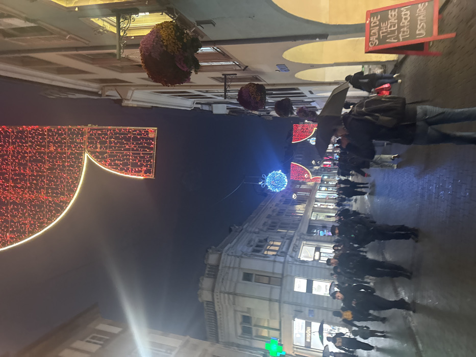 An evening street scene shows a crowd walking, with many holding umbrellas. Buildings line both sides, adorned with festive red and blue lights. Flower baskets hang overhead. A sign reading "Salon de The" is visible. The street appears wet, reflecting the lights. Buildings are tall and appear to be historical, with windows and architectural details.
