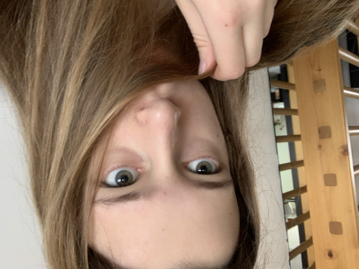 An indoor, close-up image shows a female subject, likely a young adult, with fair skin and light brown hair, looking directly into the camera