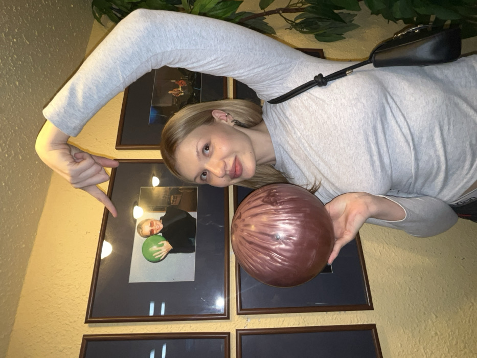The image depicts a young adult female standing indoors, likely within a bowling alley located in Chaikovsky, Russia