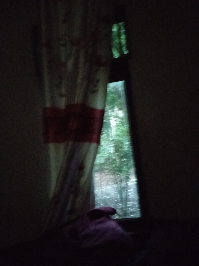 This image presents an interior view of a dark room, presumably located in Panton, Indonesia, looking outwards through a partially obscured window. A light-colored curtain, featuring a prominent horizontal red band across its mid-section and subtle patterned details, hangs on the left side, partially covering the window frame. Through the visible portion of the window, lush green foliage, consistent with trees or bushes, is discernible, suggesting an outdoor natural environment. The exterior lighting appears brighter than the dim interior. In the bottom-right foreground, a blurred object of purple-pink fabric rests on an unspecified surface, likely a windowsill or bed. No individuals or specific actions are visible within the frame.