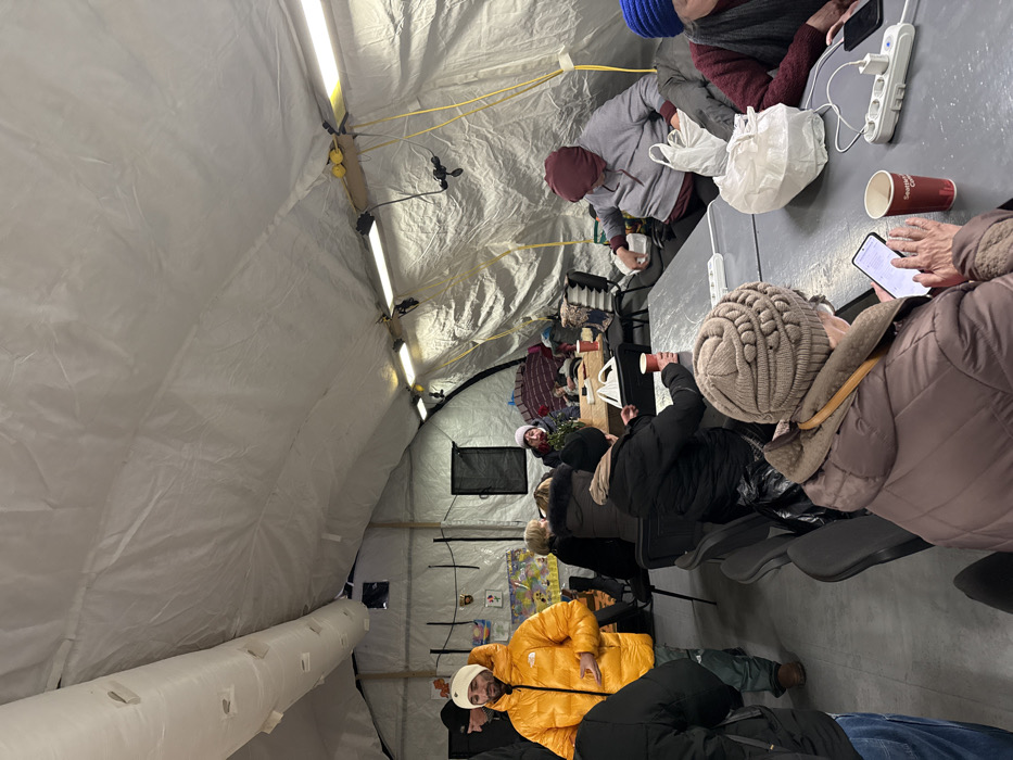 interior of a large, temporary tent structure, identified as a "Point of Invincibility" (Punkti Nezlamnosti) in Kyiv, Ukraine