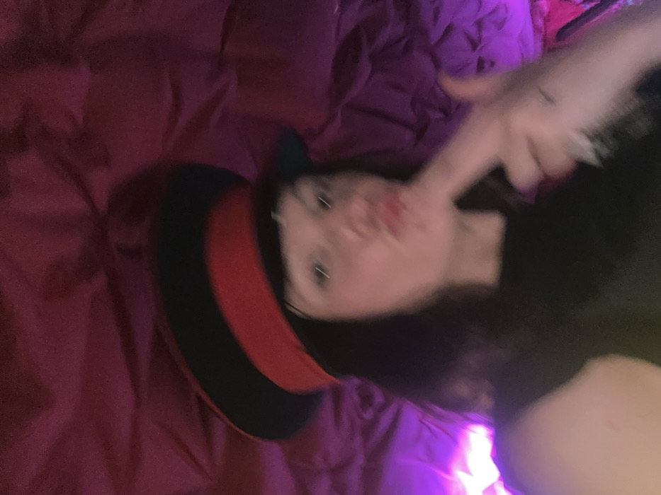 A person lies on a magenta-colored surface, possibly a bed. They are wearing a black hat with a wide red band. The person's face is visible, displaying pursed lips. Their dark hair is spread around their head. One of their hands is raised and pointed towards the camera, forming a finger-gun gesture. A blurred, purplish light source is visible in the background. The image is slightly out of focus.