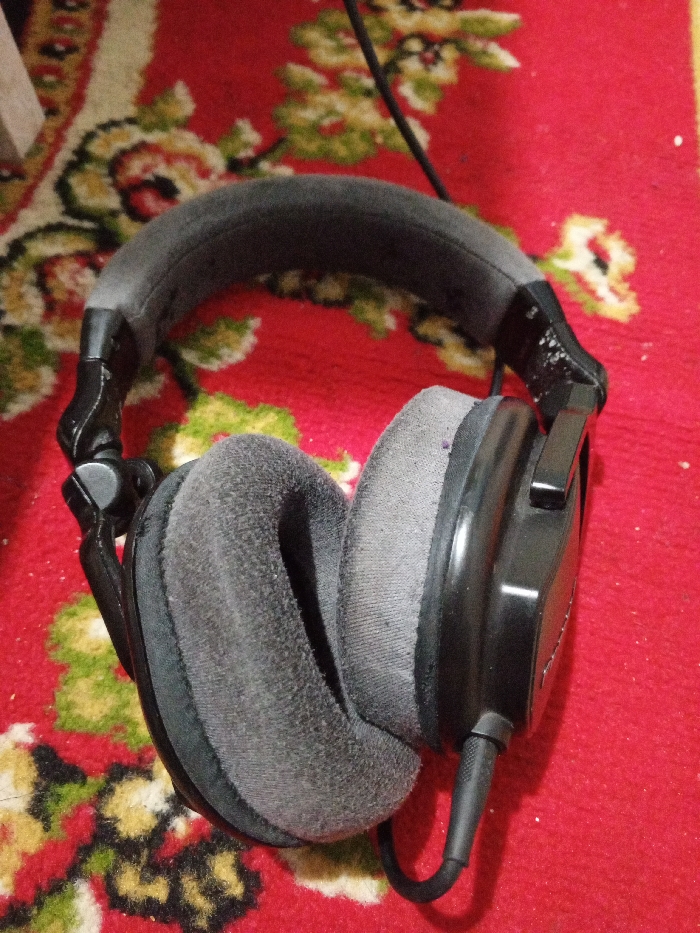 - "A pair of black over-ear headphones with a padded headband and gray fabric earcups rests on a red patterned carpet in Kpein, Liberia" by FM-UrGOL2, licensed under CC BY 4.0