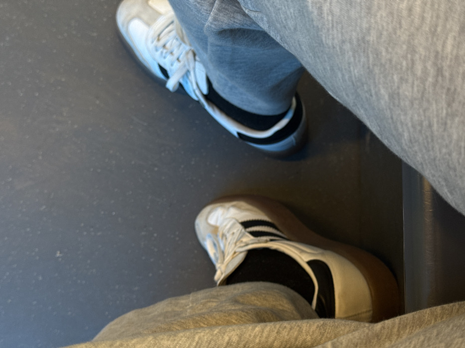 An overhead view captures a person's lower legs and feet. The subject wears light grey casual trousers, specifically sweatpants, covering both legs. On the left foot, a black sock is visible above a white sneaker featuring three black stripes on its side and a gum rubber sole. The right foot wears a similar white sneaker with black stripes, also paired with light grey trousers. The footwear appears to be Adidas Samba-style. Both feet rest on a dark grey, subtly textured floor surface, possibly a resilient flooring material. A slight horizontal raised edge or seam runs across the lower portion of the frame, suggesting a floor partition or part of a seating arrangement. The image provides no discernible visual cues to identify a specific location within Niederanven, Luxembourg, or any other city.