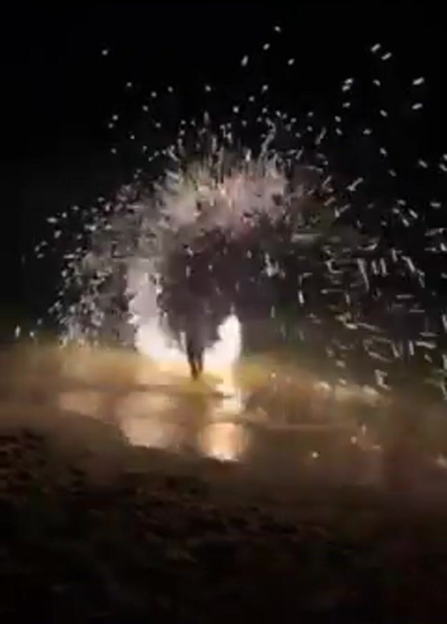 A person stands on a sandy beach at night, twirling a handheld device that throws off a spray of sparks in a circular motion