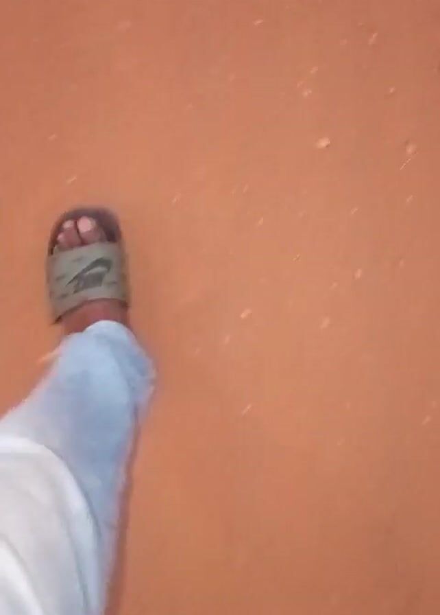 A person wearing a white robe and light-colored sandals is walking on a reddish-brown surface. The camera is pointed down, showing only their feet and the ground. The video is slightly blurry, likely due to movement.
