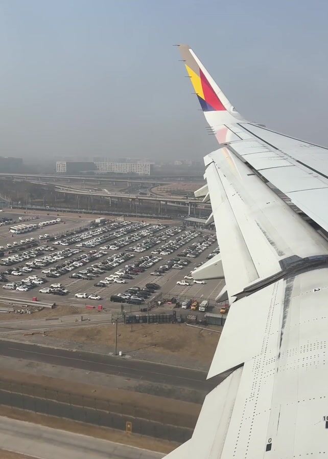 view from an airplane window during descent, with the wing of the Asiana Airlines plane prominently visible