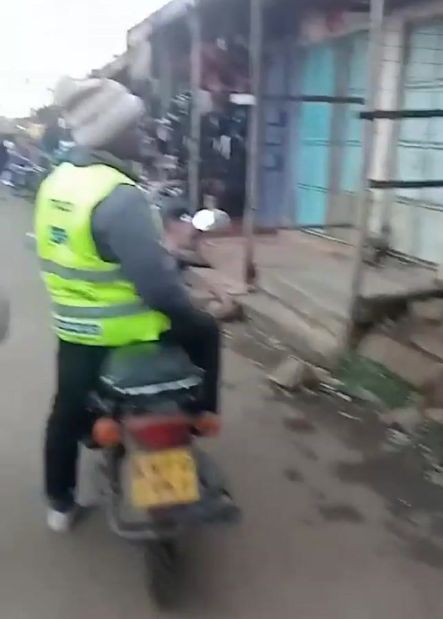 A person in a gray jacket and dark pants walks on a street alongside parked motorcycles and small businesses. The person has a large white bag slung over their shoulder. A person in a yellow safety vest and black pants is seated on one of the motorcycles. The street appears busy.