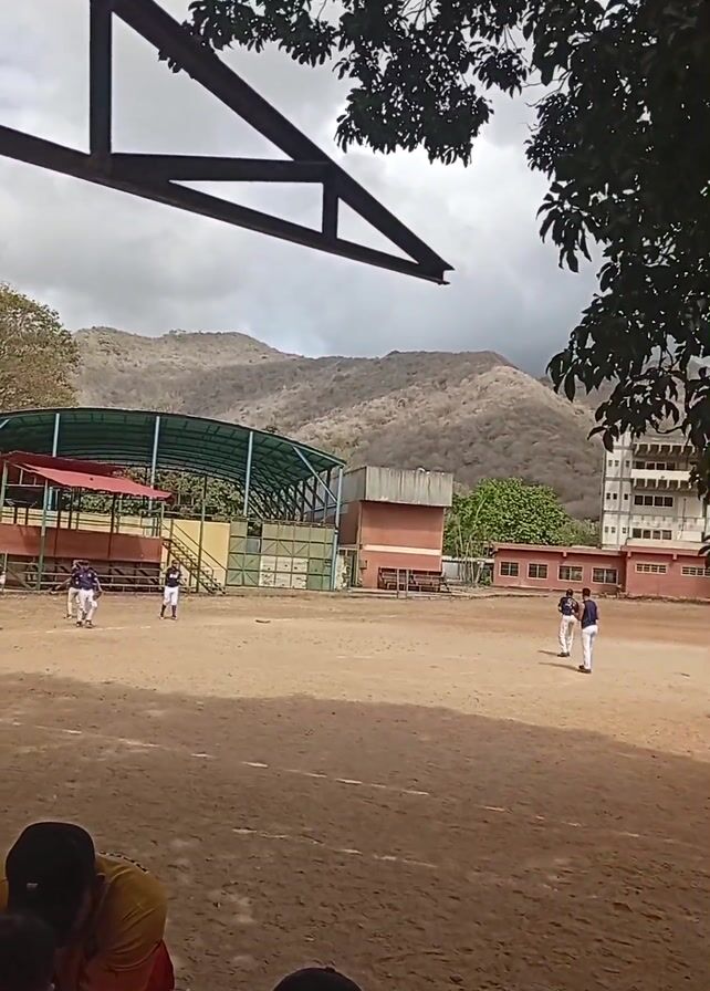 baseball game. Several people, likely coaches or team members, are watching from under the shade of a structure or tree. In the foreground, several people are wearing baseball jerseys. In the background, the baseball field is visible, with players in various positions. Beyond the field, there are buildings, trees, and a mountain range. The sky is cloudy. The camera pans to the left, following the movement of players on the field, and then pauses to show a different group of people watching the game. The environment appears to be a baseball field in a somewhat rural or suburban setting.