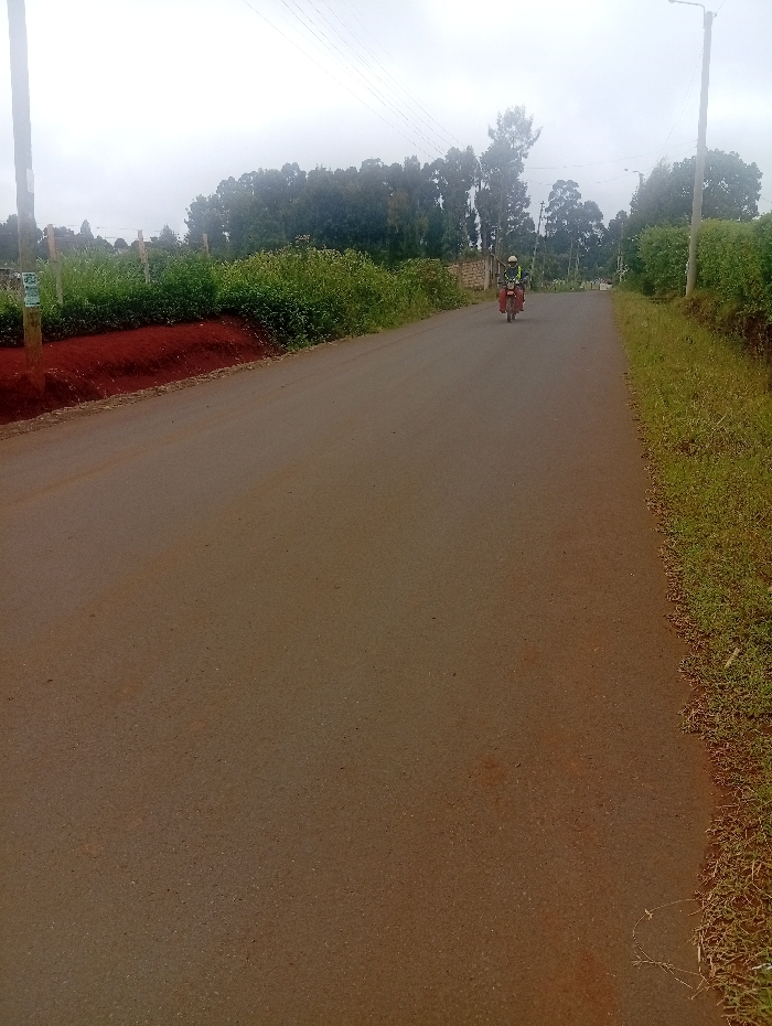 A paved road stretches into the distance under a cloudy sky. A motorcyclist, wearing a helmet and light-colored clothing, drives toward the viewer. Lush greenery and trees line both sides of the road. A utility pole stands on the left, with power lines overhead. A lamp post is visible further down the road on the right. A strip of red soil borders the vegetation on the left.