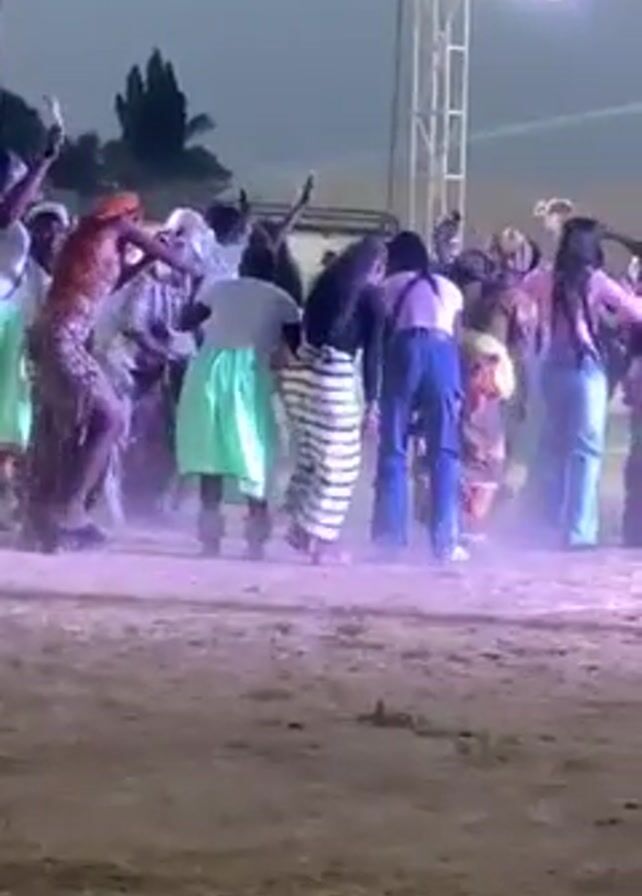 group of people dancing in a circle on a dirt field. They are dressed in a variety of clothing, including skirts, pants, and shirts. Some of the women are wearing head coverings. There is a stage in the background with lights and speakers. It is evening or night and dusty around the group.