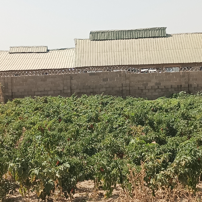 A forensic scene capture from Barakin Sabawa, Nigeria, reveals a cultivated field in the foreground, densely populated with green chili pepper plants, many bearing red fruit, set in dry, light-colored soil. Behind the field, a gray concrete block wall approximately 2.5 meters high spans the midground, fortified with multiple strands of razor wire along its top edge. In the background, sections of a structure featuring a light-colored corrugated metal roof and distinct green ridge vents are visible above the wall. The environment is brightly lit under a clear, pale sky. No human figures, specific activities, or interactions are present.