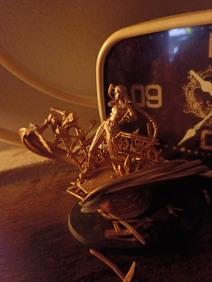 A golden miniature depicting a female figure standing on a fanciful conveyance is centered in the frame. The conveyance features intricate lattice-like details and curved elements. A second, smaller figure is seated at the front. It rests on a dark wooden surface. Behind the miniature is a clock, displaying the number "09" prominently on its face. The overall lighting casts warm shadows.