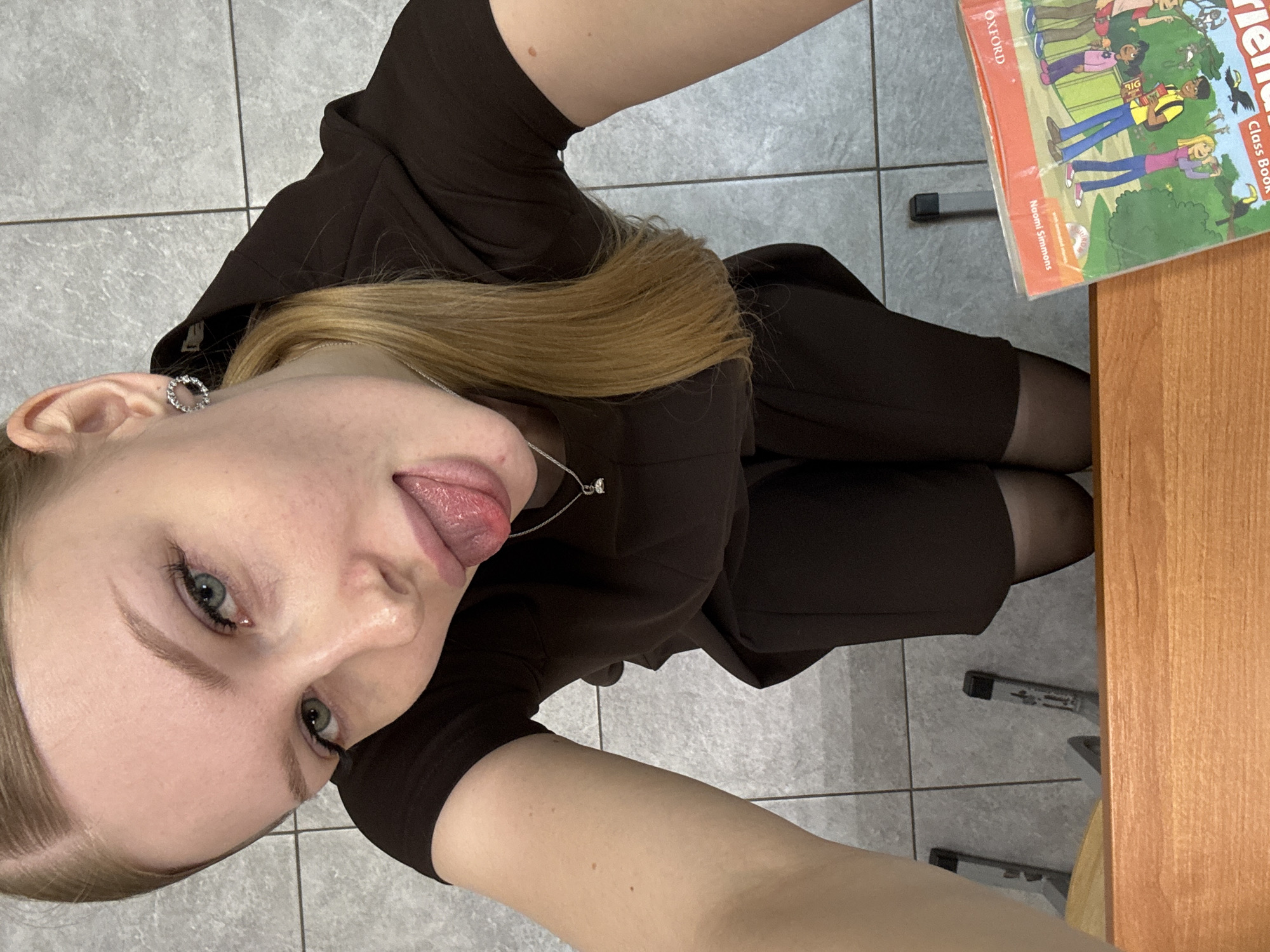A selfie taken by a young woman with light hair and fair skin. She is wearing a dark brown dress or top and black tights. Her tongue is sticking out. She has an earring on her left ear and a necklace. Next to her is a wooden table with a book titled "Friends Class Book" by Oxford. The floor is tiled in light grey with dark grout lines. The photo appears to be taken indoors. There is no way to confirm that this picture was taken in Perm, Russia, from this one picture alone.