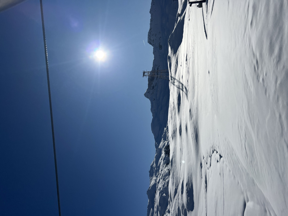 The image captures a bright, snow-covered mountain landscape within the Valtournenche commune, Italy. A clear, deep blue sky occupies the upper half, with the sun prominently positioned in the upper right quadrant, emitting intense glare and a starburst lens flare. A heavy, dark-grey cable, indicative of a ski lift line, stretches horizontally across the upper third of the frame. In the midground, a tall, metal lattice ski lift tower stands, casting a long, distinct shadow diagonally to its left across the snow-covered terrain. The snow surface is uneven, displaying natural undulations and subtle patterns. A dark, partial structure, consistent with a component of a ski lift (e.g., a chair or base), is visible on the far right edge of the foreground. The background features a range of snow-capped mountains under a mix of sunlight and shadow. No individuals are present. A faint white contrail is visible in the upper right sky, above the mountain range.