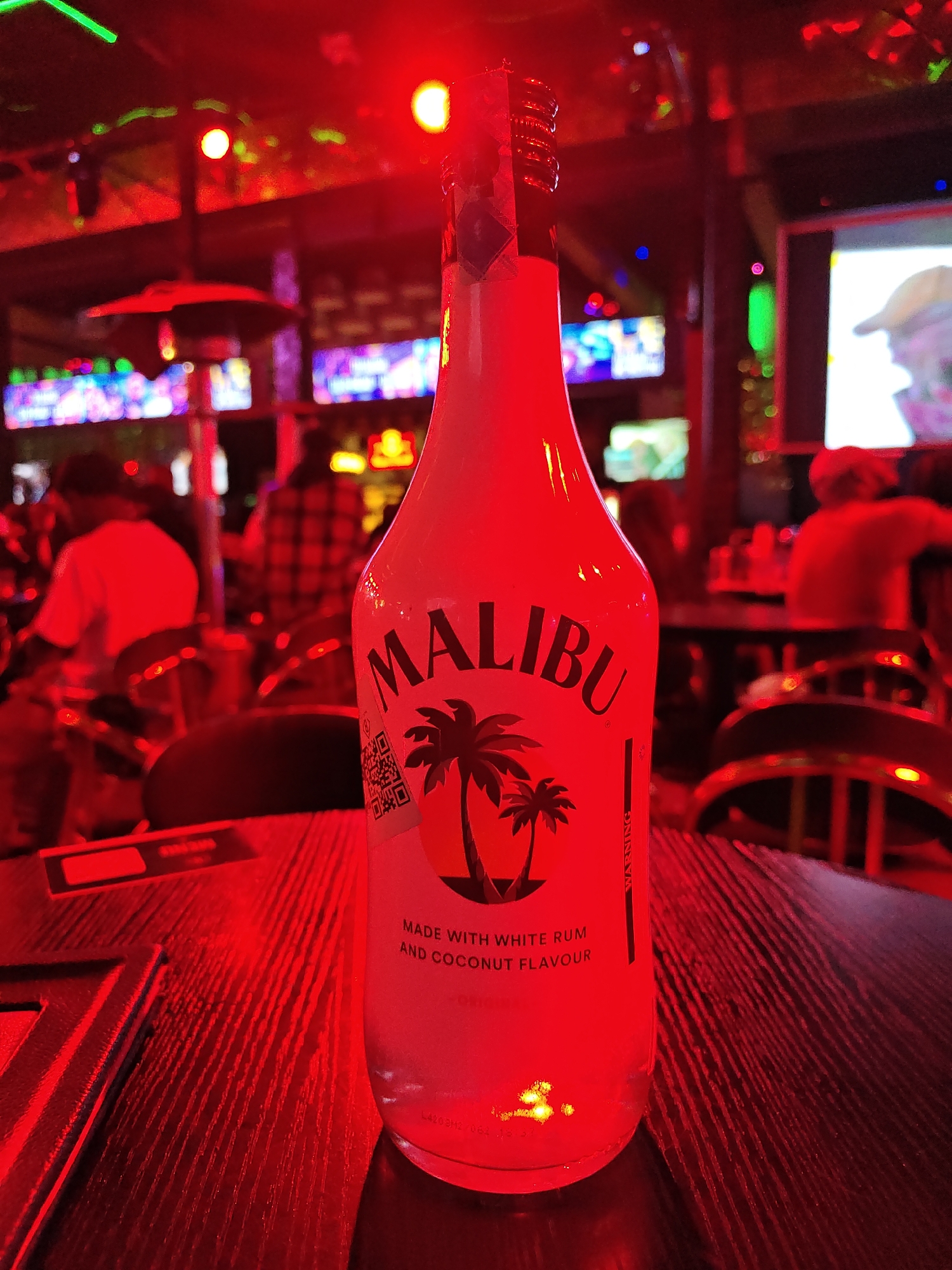 The scene depicts the interior of a nightlife establishment in Eldoret, Kenya, illuminated predominantly by a pervasive red light. In the immediate foreground, a nearly full, clear glass bottle of Malibu Original white rum stands upright on a dark, textured wooden table. The bottle's label features the brand name "MALIBU" above an orange circle containing two black palm tree silhouettes, a QR code on the left, and the text "MADE WITH WHITE RUM AND COCONUT FLAVOUR." To the left of the bottle on the table, a dark rectangular object, possibly a menu or coaster, is partially visible. The background is blurred, showing multiple individuals and various light sources. To the mid-left, a seated person wearing a light-colored shirt is visible from the back. Centrally, another seated individual wears a red and black plaid shirt. Partially visible dark chairs with metallic (likely gold-toned) accents are situated around the patrons. Numerous illuminated screens displaying colorful, indistinct imagery are scattered throughout the background. The upper portion of the scene reveals several red, green, and blue decorative lights, including a distinct green laser-like line across the upper left. A dark light fixture or decorative element with a broad, flat top is visible in the upper-mid-left. The overall environment suggests an active bar or club setting.