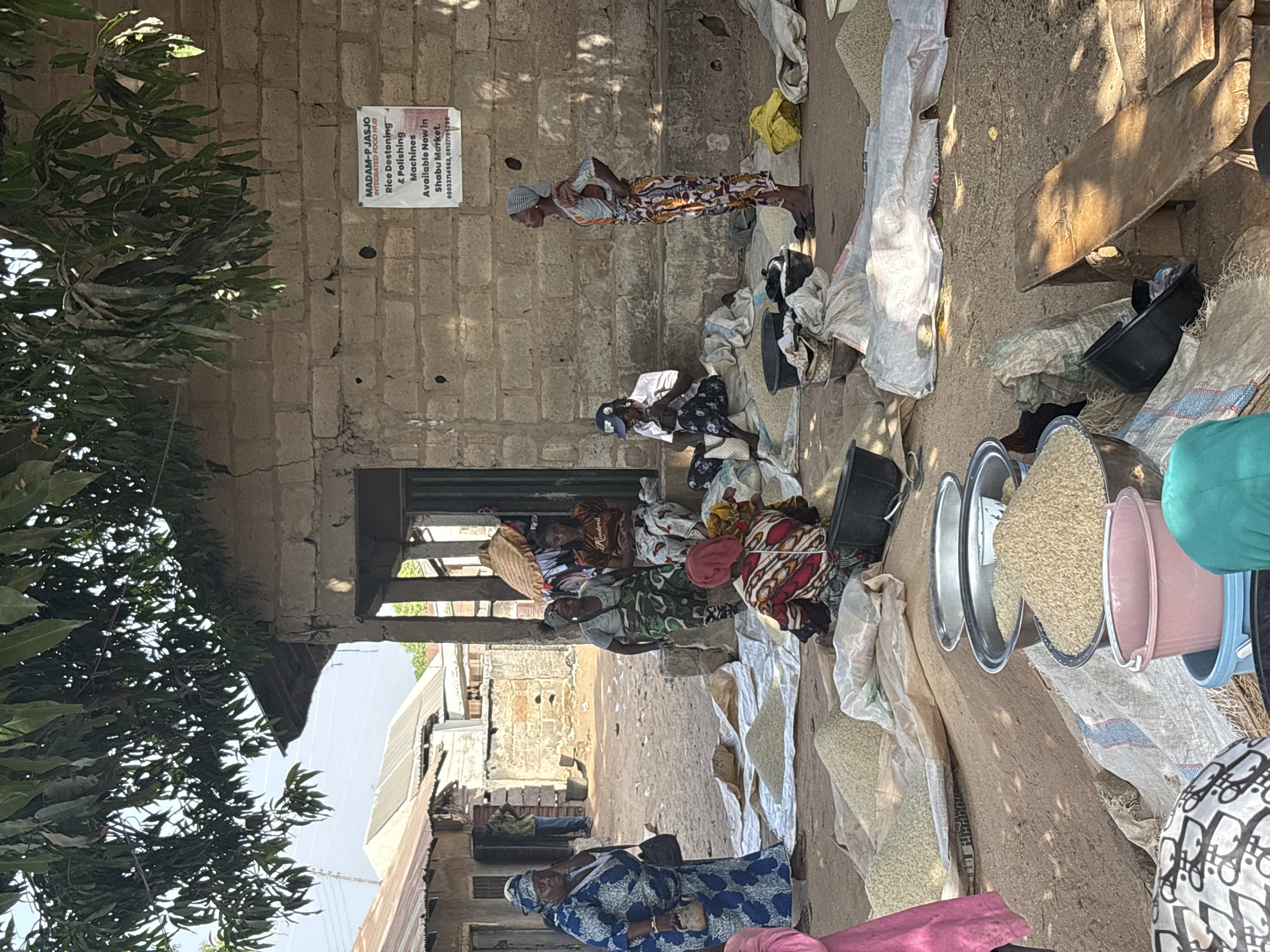 This image depicts an outdoor market or rice processing area in Lafia, Nigeria, specifically near the Shabu Market, as indicated by a sign