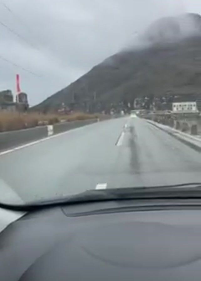 A car drives on a wet road next to a body of water on a cloudy day. A green mountain partially obscured by clouds looms ahead. On the right side of the road there is a building located next to the water. Electrical lines run parallel to the road on the left.