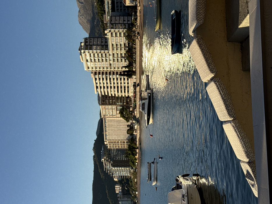 This image depicts a coastal scene in Rafailovići, Montenegro, captured from an elevated perspective looking across a bay towards the shore and mountains. The sky is clear and light blue, occupying the upper portion of the frame. In the background, dark green, rugged mountains rise, partially obscured by a dense line of multi-story modern buildings (residential or hotel complexes) that stretch along the curved coastline. These buildings exhibit varying architectural styles, including those with numerous balconies, glass facades, and some structures that appear to be under construction or renovation. Palm trees and other vegetation are interspersed along the base of these buildings and the shoreline. The midground features a calm body of water, likely a bay, with a significant amount of sunlight reflecting off its surface, creating a shimmering path from the right. A sandy or pebbly beach is visible at the water's edge, with a few indistinct human figures present. Several boats are moored or anchored in the water: a white open boat with the registration "BD 181" is partially visible in the lower-left foreground; two smaller, light-colored open boats are positioned further left in the midground; a larger white and black cabin cruiser with a canopy is anchored centrally; a dark blue/green dinghy floats to the right of the cruiser; and a light green or yellow dinghy is situated towards the far right of the water. In the immediate foreground, to the lower right, a series of concrete steps ascends diagonally. The visible steps are topped with three light-colored cushions featuring a repeating geometric pattern. No discernible actions or specific interactions between individuals are evident.