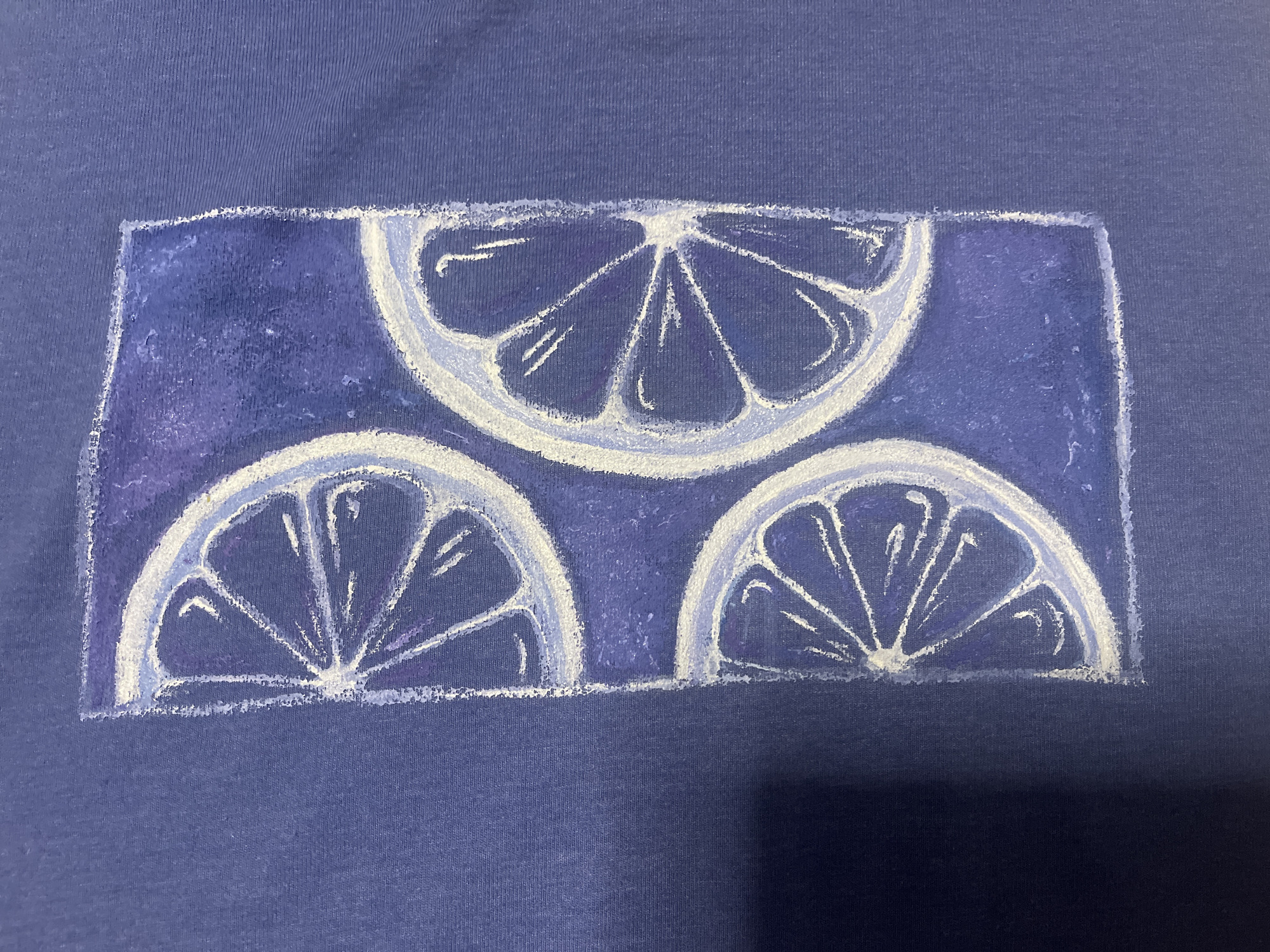 rectangular design painted on a blue fabric, possibly a t-shirt. The design depicts three half-slices of citrus fruit arranged in a rectangular frame. The top slice is centered, while the two lower slices are placed side by side. The slices are rendered in white with internal details of segments and rind. The rectangular background of the slices is a darker blue, providing contrast. There is no indication of the location being Saarbrücken, Germany.