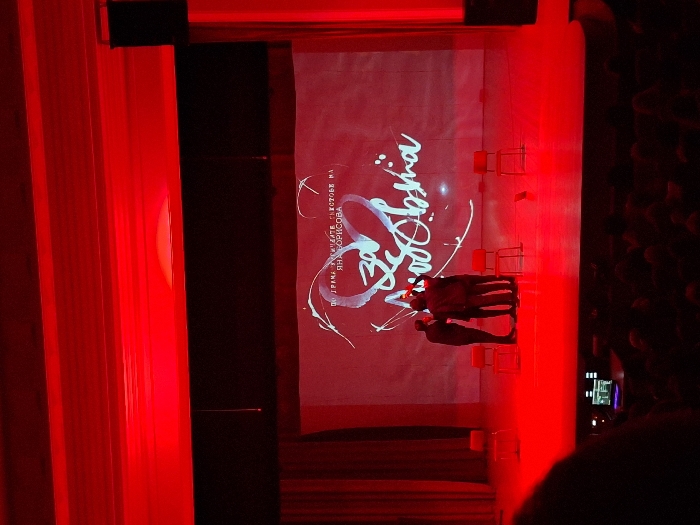 The image depicts an indoor theatrical or event space, likely a hall or auditorium, in Haskovo, Bulgaria