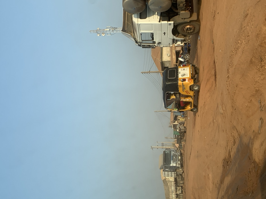 A street scene featuring various vehicles, including a yellow three-wheeled auto rickshaw, large trucks, and smaller cars, are parked along a dirt road. Utility poles line the street, with an antenna towering in the background. The sky is a clear blue, while the ground is dusty. The overall impression is of a busy, possibly roadside, area.