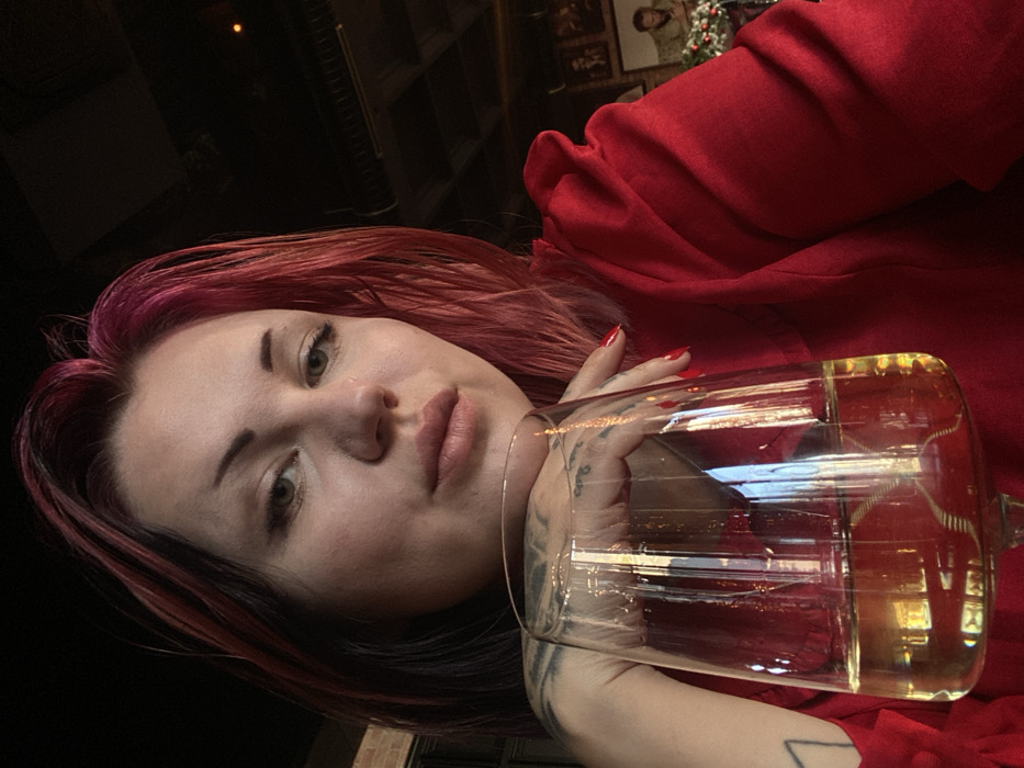 The image displays a head-and-shoulders shot of a woman in an indoor setting identified as being in Ulcinj - Ulqin, Montenegro. The subject has shoulder-length hair, dyed magenta-pink with darker roots. Her skin tone is fair, and she has light-colored eyes, dark defined eyebrows, and full lips. She wears a red garment with a ruffled or gathered detail on the right shoulder. Her left hand, painted with red nail polish, is positioned in the lower foreground, resting against a large, clear stemmed glass. Visible tattoos on her left arm include a triangular design on the inner forearm and subtle markings on the fingers. The glass contains a light amber liquid, consistent with white wine, reflecting elements from the environment. The woman maintains a direct gaze towards the camera. The background is dimly lit, featuring a dark ceiling with exposed metallic structural or ventilation components. To the blurred right, framed images are visible on a wall, one depicting a male figure. Below these frames, out-of-focus festive decorations, including string lights and green foliage, are discernible. A brick-patterned wall is partially visible on the left side of the frame.