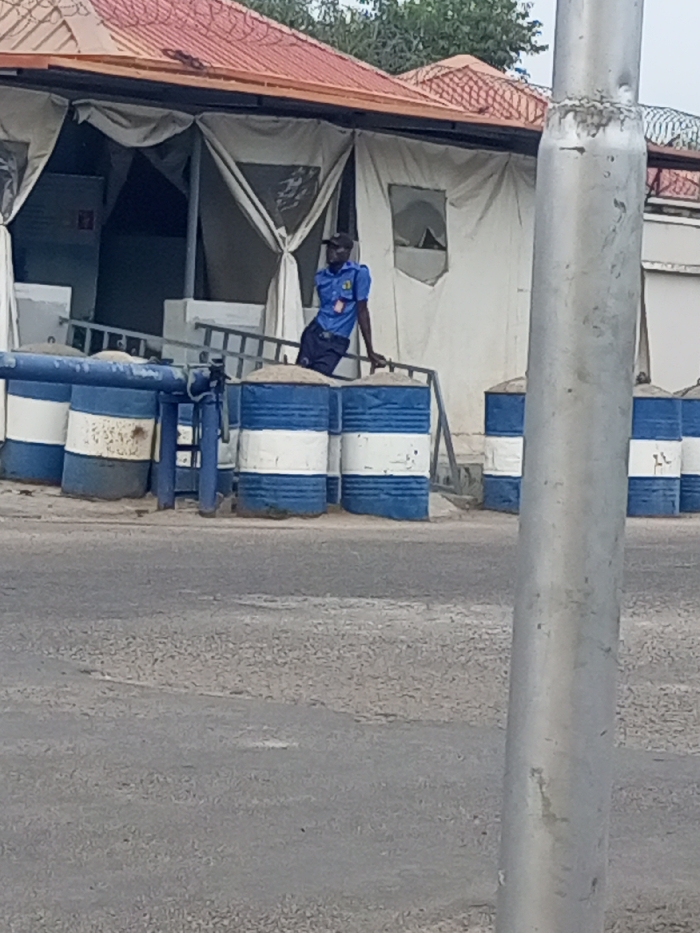 man in a blue uniform standing near a building with white tents and a metal pole in the foreground. The man is leaning on a metal railing, which is in front of a row of blue and white barrels. The building has a red roof and a partial view of a door. There are two windows on the side of the building, and one of them is broken. The building is located in Maiduguri, Nigeria, at coordinates 11.819 latitude and 13.156 longitude. The ground is paved with asphalt and looks cracked in some areas. The overall scene is one of a security checkpoint or perimeter. The image is taken from a slightly low angle, creating a perspective that makes the man appear larger than he would normally be. The background of the image is out of focus, and the only objects in focus are the man, the barrels, and the metal pole. The image is well-lit, and the colors are vibrant.