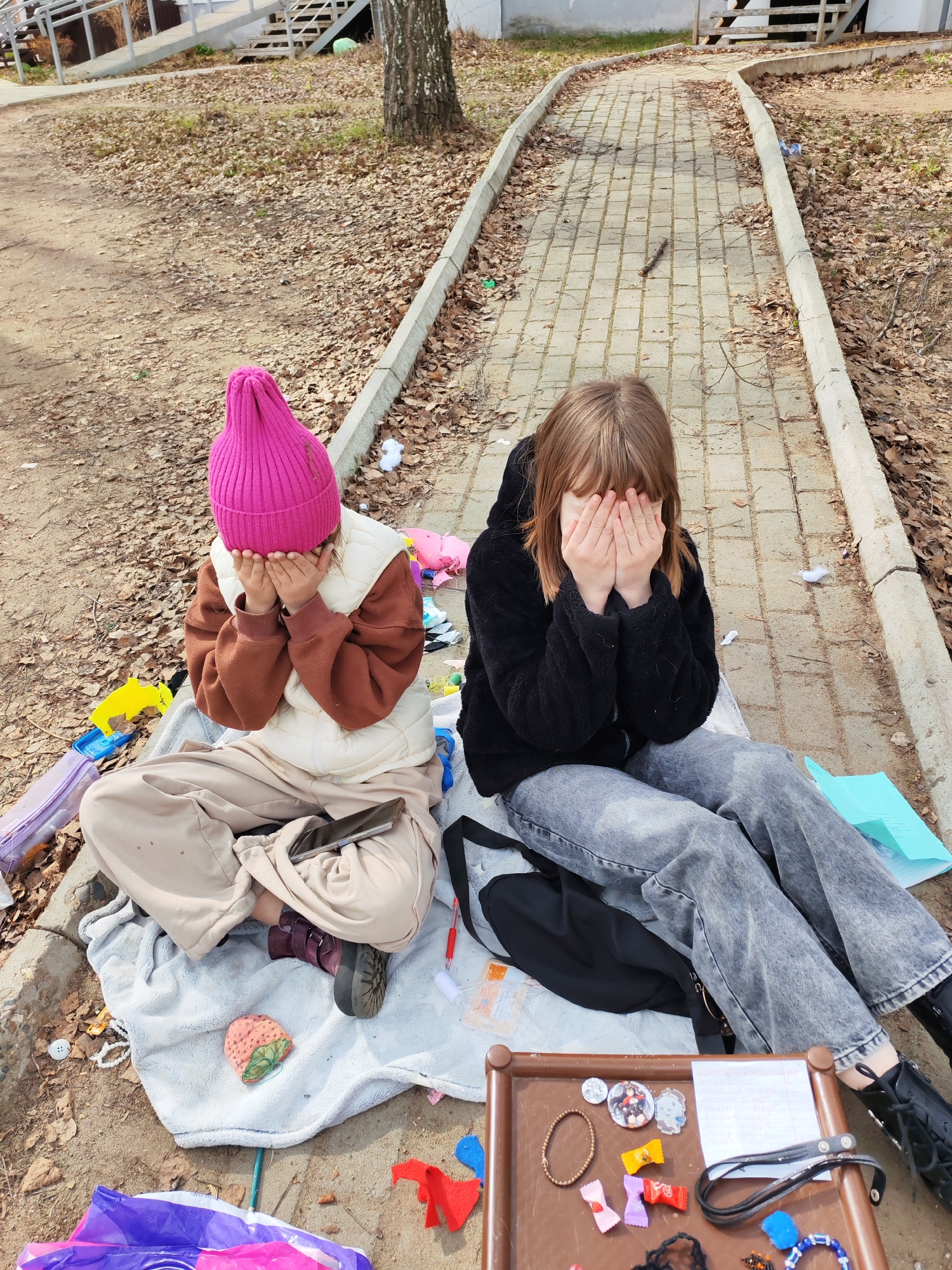 Two young girls sit cross-legged on a grey blanket on the ground outdoors in Chaikovsky, Russia. Both girls cover their faces with their hands. The girl on the left wears a pink beanie, brown sweater, white vest, tan pants, and burgundy shoes. A smartphone sits on her lap. The girl on the right wears a black jacket, grey jeans, and black boots. A black backpack sits behind her. A brown tray rests on the ground in front of the girl on the right, filled with various items including bracelets, candies, and small trinkets. Scattered around the blanket are toys, papers, and other small objects. The ground is covered in dry leaves and trash. A paved walkway with grey concrete borders runs behind the girls, leading towards a set of stairs. A tree stands near the walkway.