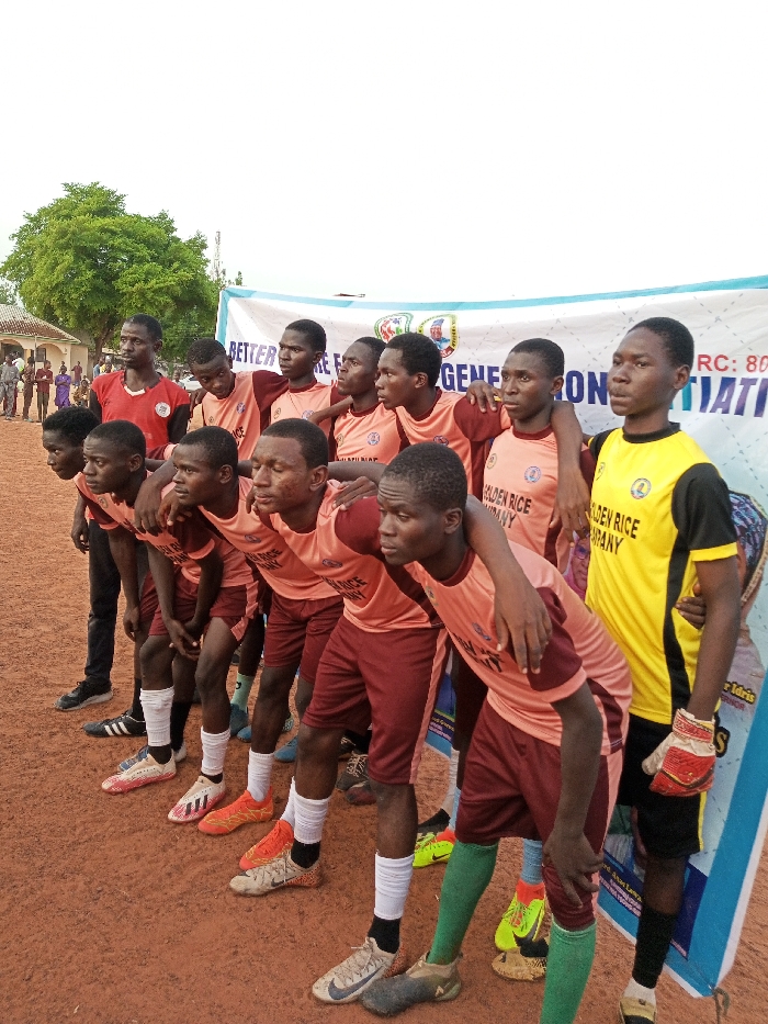 A group of eleven young men, all wearing soccer uniforms, stand in a line facing the camera. They are posed with their arms around each other, in what appears to be a team photo. A large banner behind the group states, "Better Future Generation," followed by a logo and the words "Golden Rice Company." There is a red clay ground below the team, and the sky is overcast. The location is in Birnin Kebbi, Nigeria, at coordinates 12.441, 4.193.