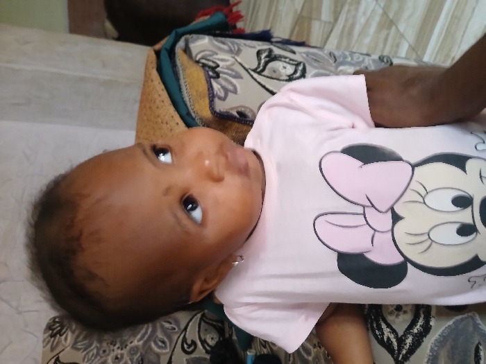 A close-up image shows an infant with dark skin and sparse dark hair, seated in an indoor environment