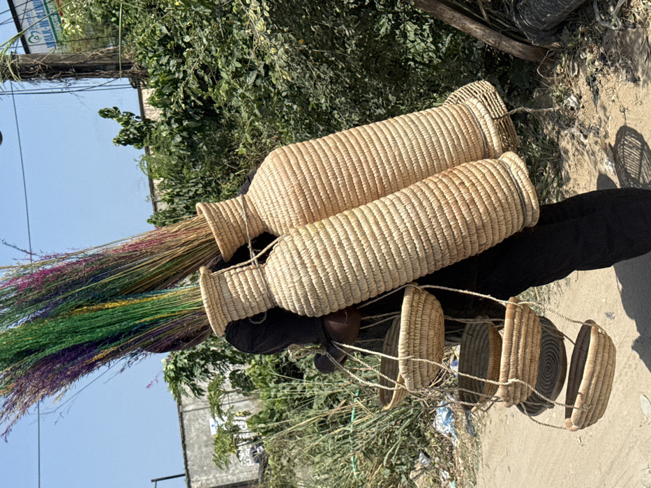 An individual, dressed in dark clothing, is observed in Ojomu, Nigeria, carrying multiple woven items on an unpaved dirt path. The person is carrying two large, cylindrical, bottle-shaped baskets, made of natural light-brown woven material, on their back. Each large basket contains a dense bundle of long, thin, multi-colored decorative grasses or reeds, displaying hues of green, purple, yellow, and pink. Five smaller, round, shallow woven baskets are suspended by ropes from the individual's left side. The scene is outdoors under clear skies, casting distinct shadows on the ground. The background features dense green foliage on the right, a light-colored wall or building structure on the left, and a utility pole. A sign for a "PERFECT WALK-IN CLINIC" is partially visible in the upper right background.