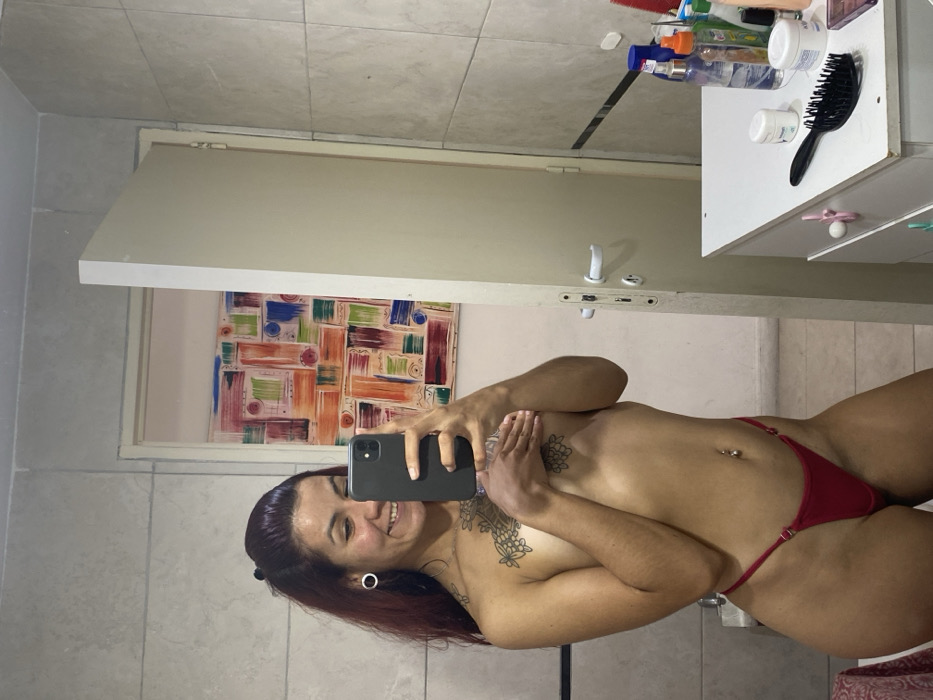 An adult female is depicted taking a mirror selfie in what appears to be a bathroom. The specific city of Wilde, Argentina, as requested, cannot be verified from the visual information provided. The female has dark reddish-brown hair, partially tied back, and is smiling towards the smartphone she holds in her right hand, which is positioned to obscure her upper chest. Her left hand is also placed over her chest. She displays gauged earlobes and multiple tattoos, including a large floral/geometric design on her left shoulder and chest, and another on her mid-chest. A navel piercing is also visible. She is wearing a red string thong. The background consists of light gray tiled walls, with a darker horizontal tile stripe visible. To the right of the female's reflection, a white vanity with drawers is present, holding various toiletries (bottles, small containers), and a black hairbrush. A partially open light-colored door is visible in the reflection, revealing a background room with an abstract artwork featuring colored rectangles and circles.