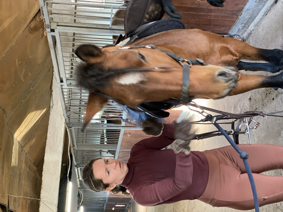 The scene takes place inside a stable at an equestrian facility in Podlastva (Poljice), Montenegro. An adult female, positioned to the left, is interacting with a bay horse. The woman has dark hair pulled back and wears a maroon long-sleeved turtleneck top, rust-colored riding breeches, and light brown gloves. Her gaze is directed towards the horse, and her hands are engaged with a black bridle, holding its reins and bit. A blue rope, possibly a lead rope, with a knot tied near its end, is visible extending downwards from her left side. The horse is a bay with a dark mane and tail, featuring a prominent white blaze on its forehead. It is saddled with an English-style black saddle and a black bridle. The horse stands calmly, facing slightly right of the frame. The environment consists of multiple horse stalls visible in the background, constructed with wooden lower panels and metal bar upper sections. The stable interior features a light-colored, possibly corrugated, ceiling with exposed beams and fluorescent strip lighting. Natural light enters from an unseen source, illuminating parts of the ceiling and floor. The floor appears to be a light-colored concrete or packed earth surface.