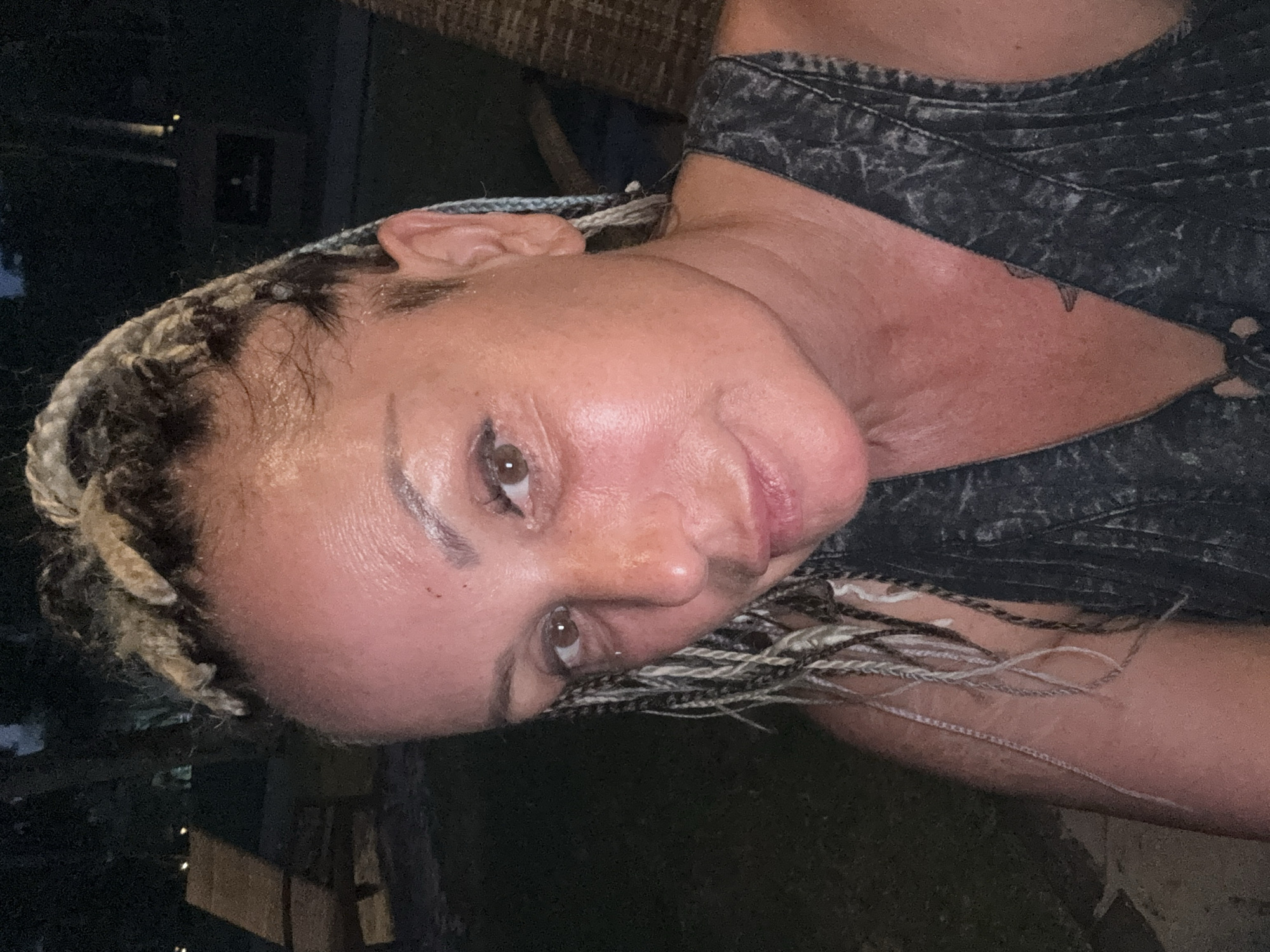 A close-up portrait shot depicts a woman with braided hair. The braids are a mix of colors including blonde, white, and dark brown. The woman is wearing a dark, textured top. She appears to be outdoors, with a dimly lit background showing greenery and a partially visible wooden structure. Due to the lack of visible landmarks or other identifying features, it is not possible to confirm that the image was taken in Jimbaran, Indonesia.