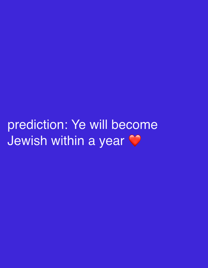The image displays a royal blue background. White text in a sans-serif font is positioned in the lower-middle section of the frame, stating: "prediction: Ye will become Jewish within a year". Immediately following the text, a red heart emoji is present. The image contains no visual elements, people, objects, actions, or environmental details that would allow for the identification of a specific geographical location, including the city of Raanana, Israel.