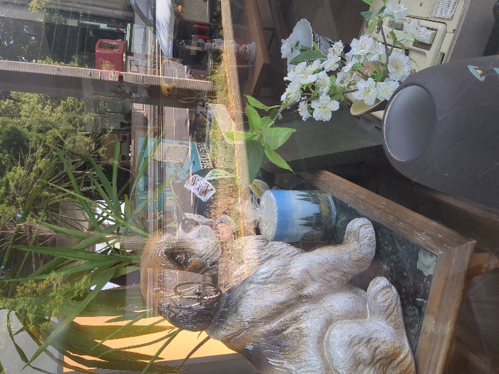 A shop window display features a mix of decorative objects. A weathered, stone-like bear sculpture rests inside a wooden frame. Next to it is a mug. Above these, a white, blossoming plant is placed near a black vase-like item. Reflections in the glass reveal an outdoor scene with plants and structures, creating a layered visual effect.