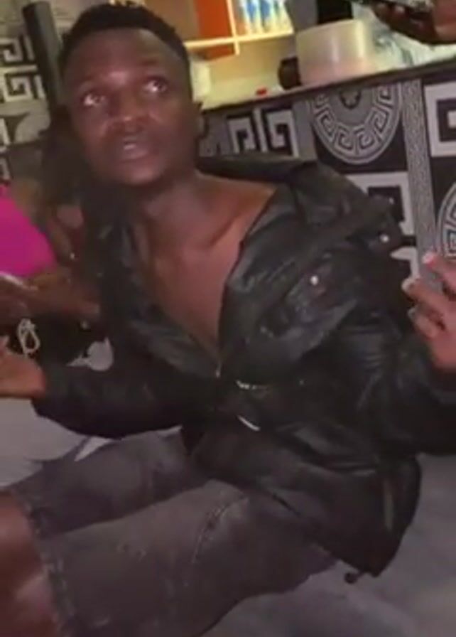 A young Black man wearing a black jacket and grey shorts is sitting inside a room. There are other people in the room, including a woman in a pink tank top. The man is looking around and talking, occasionally gesturing with his hands. Behind him is a counter with shelves stocked with beverages. The walls have a black and white pattern. The lighting in the room is somewhat dim.