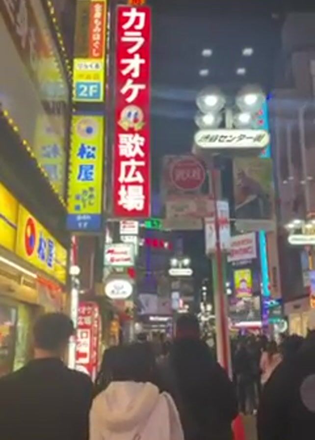 street scene in Japan at night. The street is crowded with people walking in both directions. The buildings on either side are covered in bright, colorful neon signs in Japanese. The signs advertise karaoke, restaurants, and other businesses. The street is well-lit by streetlights and the neon signs. The camera moves slowly forward, following the people walking.