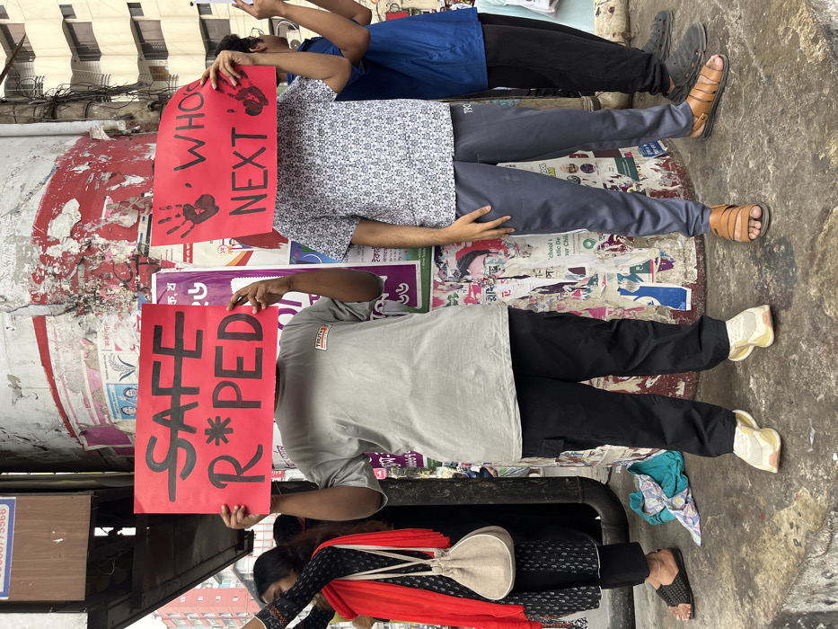 This image captures a daytime scene on a concrete sidewalk in Dhaka, Bangladesh, featuring individuals participating in a demonstration