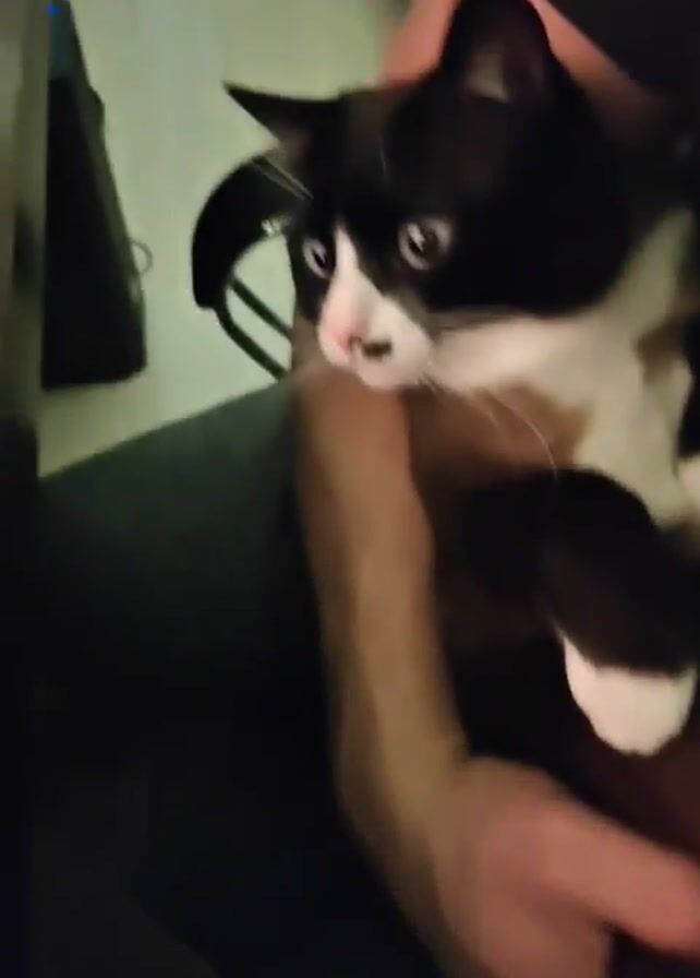 A person sits, holding a cat in their arms. The cat is mostly black with white markings around its face, chest and paws. The cat looks around warily. The person's hands are visible. A computer chair is visible in the background. The scene is dimly lit.