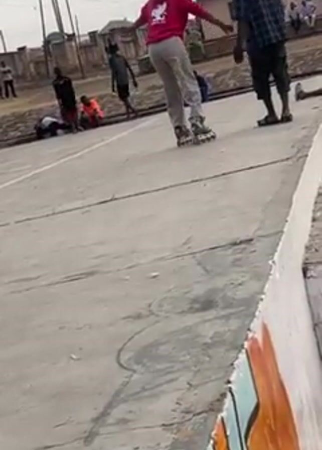 person wearing roller skates and a red hoodie being assisted by another person in a plaid shirt and shorts on a concrete basketball court. The person in the red hoodie seems to be learning to roller skate, as they are holding onto the other person for support. There are other people in the background, some sitting and others standing. Some power lines and buildings are visible in the background. The camera is positioned near a painted wall, which partially obscures the view.