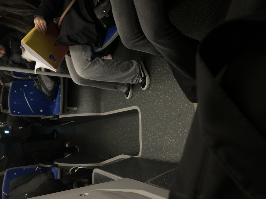An overhead shot inside a train shows two people sitting. The person on the left is holding a yellow folder and wearing black and white sneakers. The seat they are on is blue with white designs. Across the aisle, another person is sitting with dark grey pants. The floor is grey with dark grey patterns. A person wearing black is standing in the aisle facing the camera.
